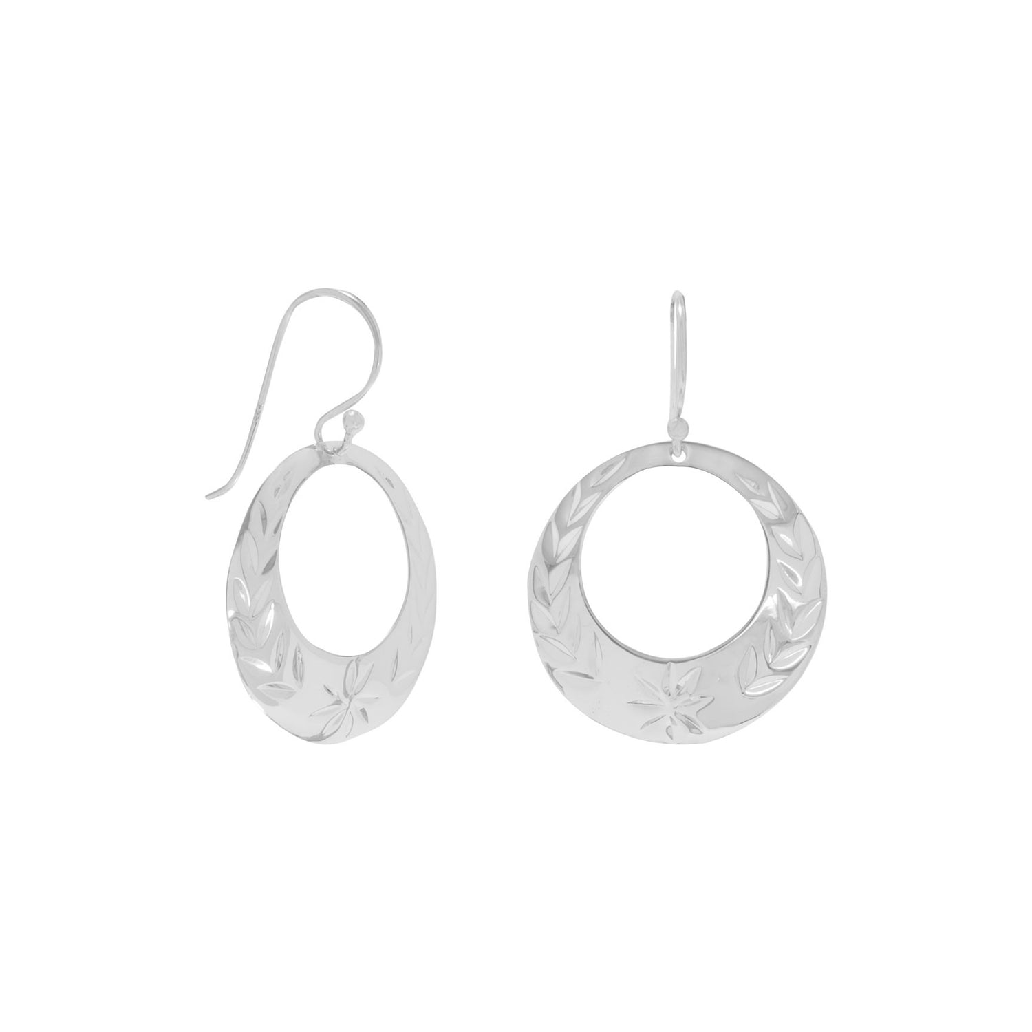 Diamond cut sterling silver french wire earrings with a floral design. The circles measure 22mm. The earrings hang approximately 36mm. .925 Sterling Silver