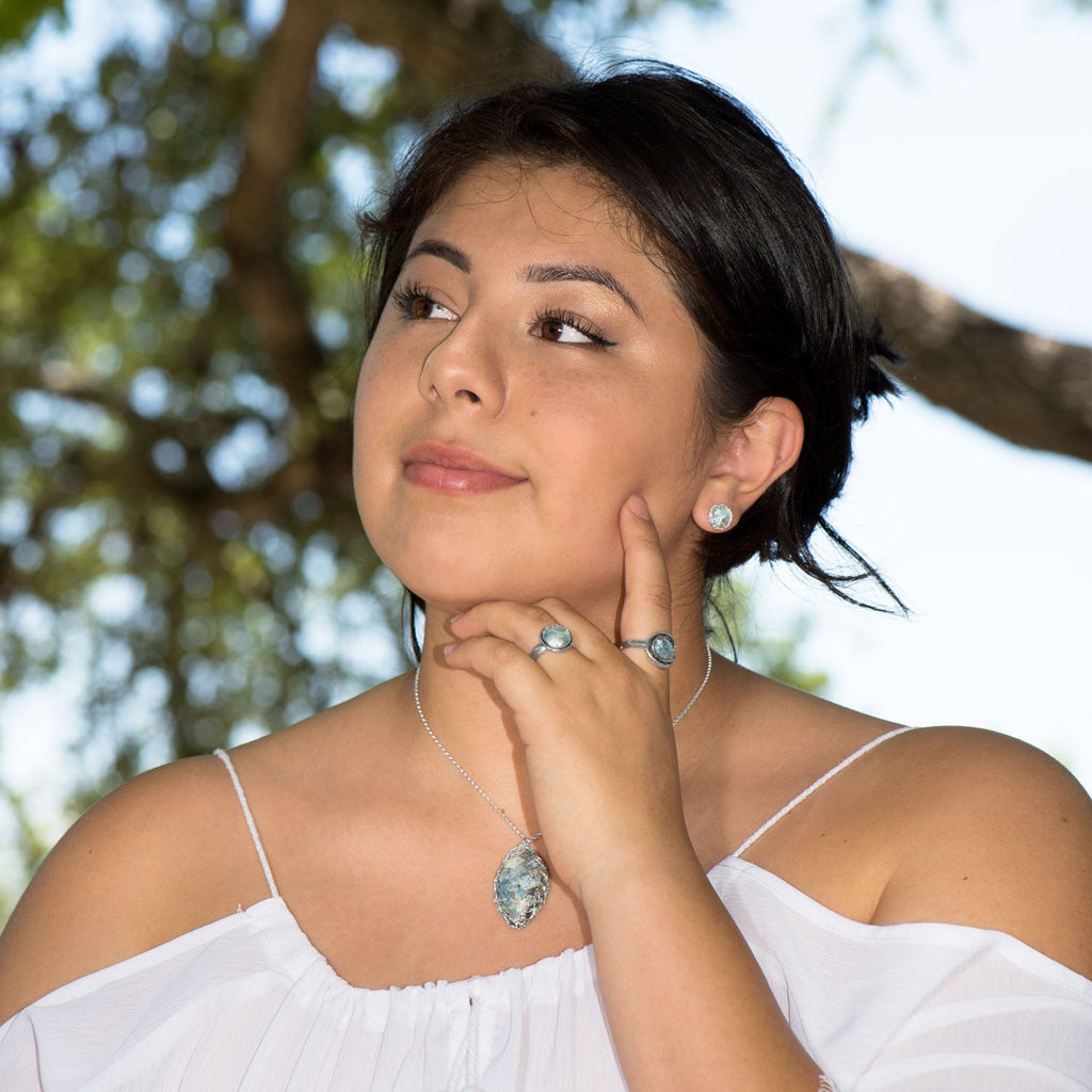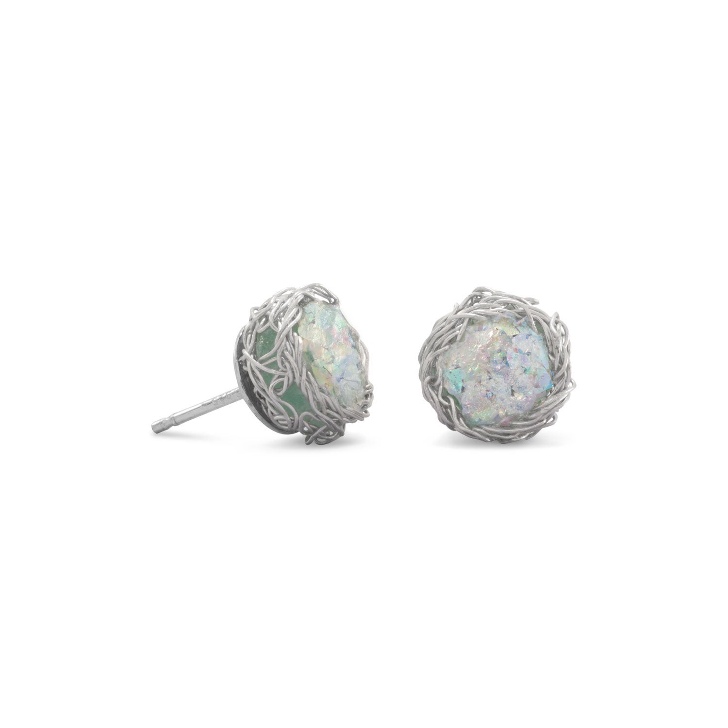 Sterling silver round 9.5mm ancient Roman stud earrings wrapped in sterling silver hand woven wire mesh setting. Ancient Roman glass coloring will vary. Comes with Certificate of Authenticity .925 Sterling Silver