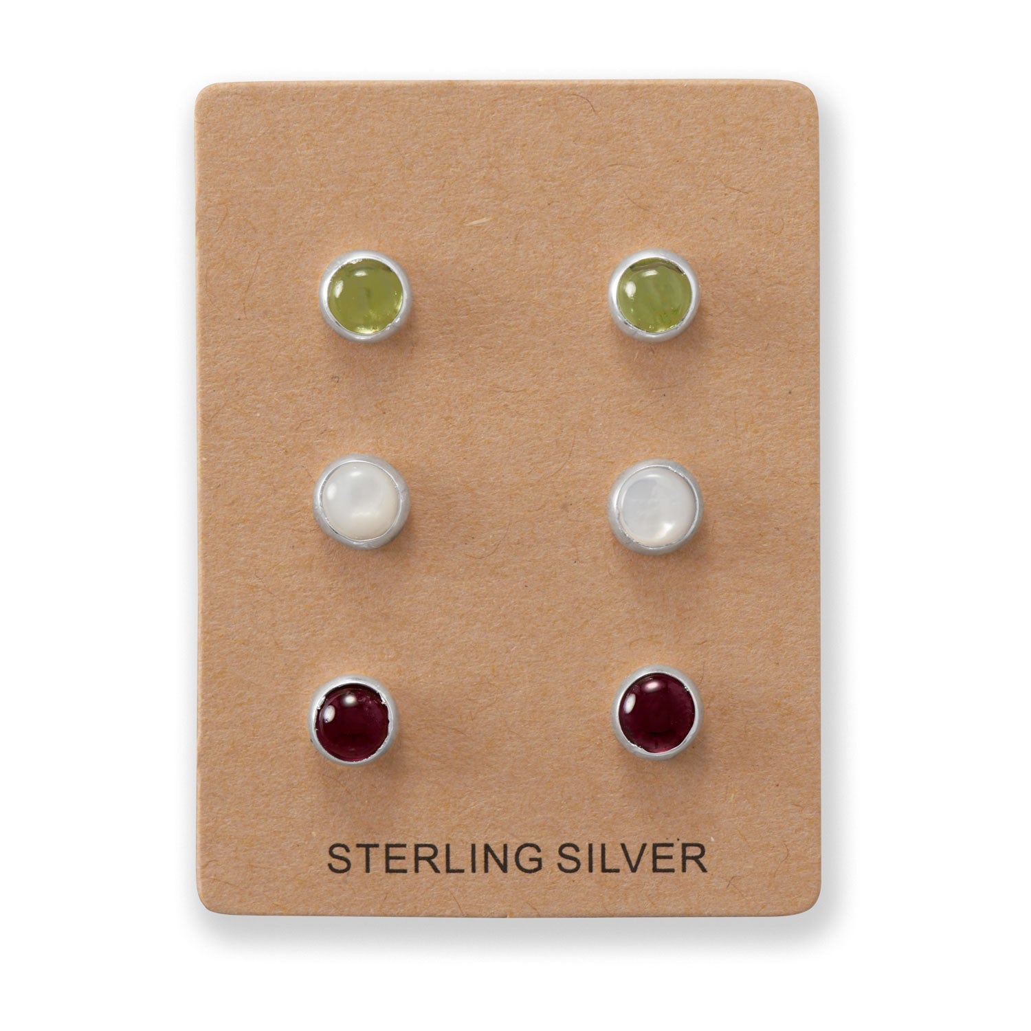 Set of 3 sterling silver 4.4mm stone button stud earrings including peridot, mother of pearl, and garnet pairs. .925 Sterling Silver