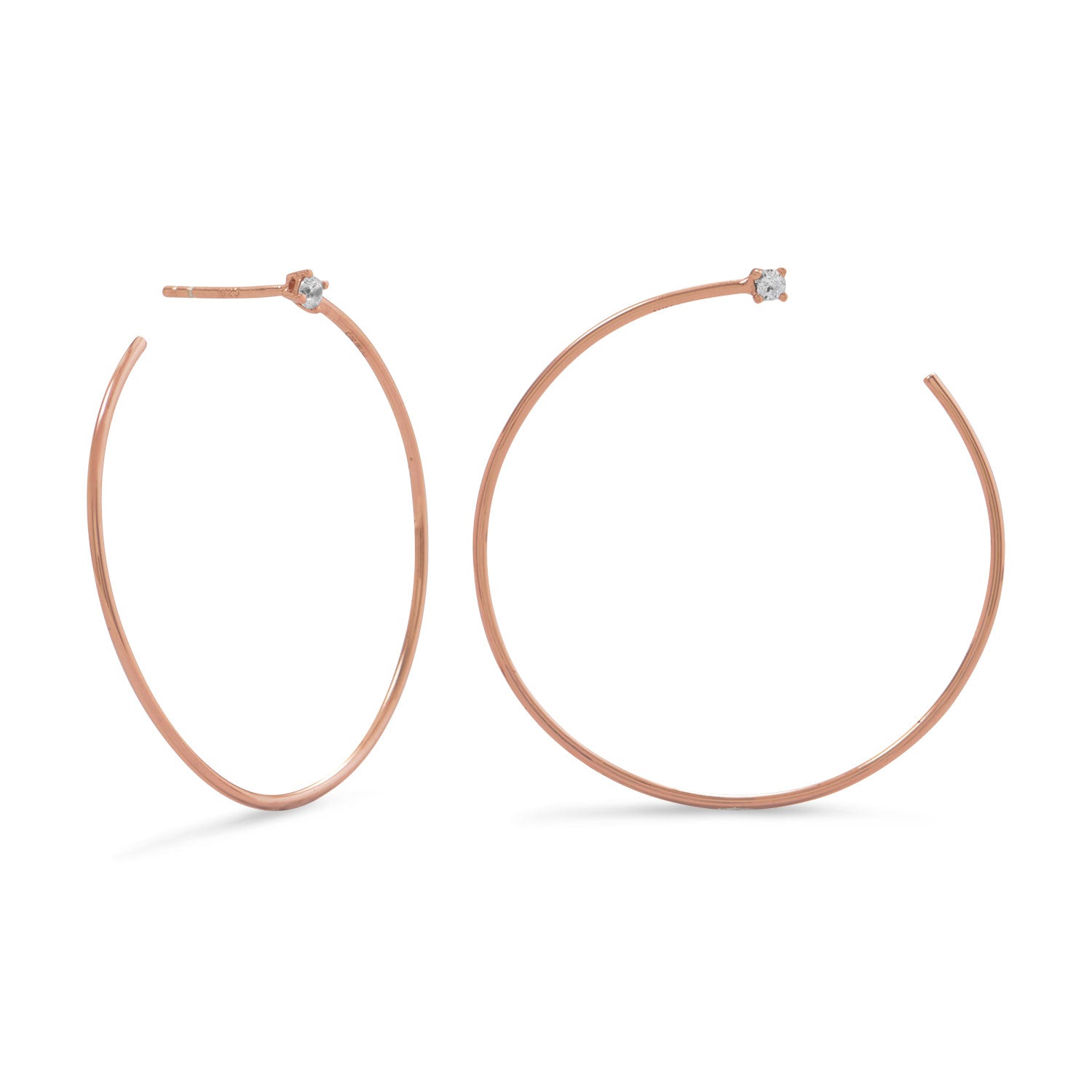14 karat rose gold plated sterling silver post back lateral 3/4 hoop earrings with a front facing 2mm CZ at the post. The hoop opening measures approximately 34mm. .925 Sterling Silver