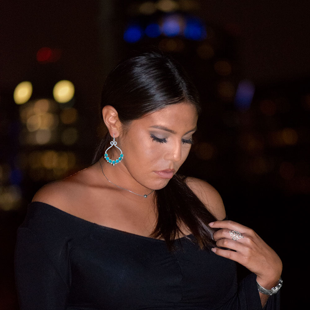 Shiny sterling silver french wire earrings featuring seven 5mm round reconstituted turquoise cabochons. Ornate drop measures 36mm x 46.3mm, full hanging length is 58mm. .925 Sterling Silver
