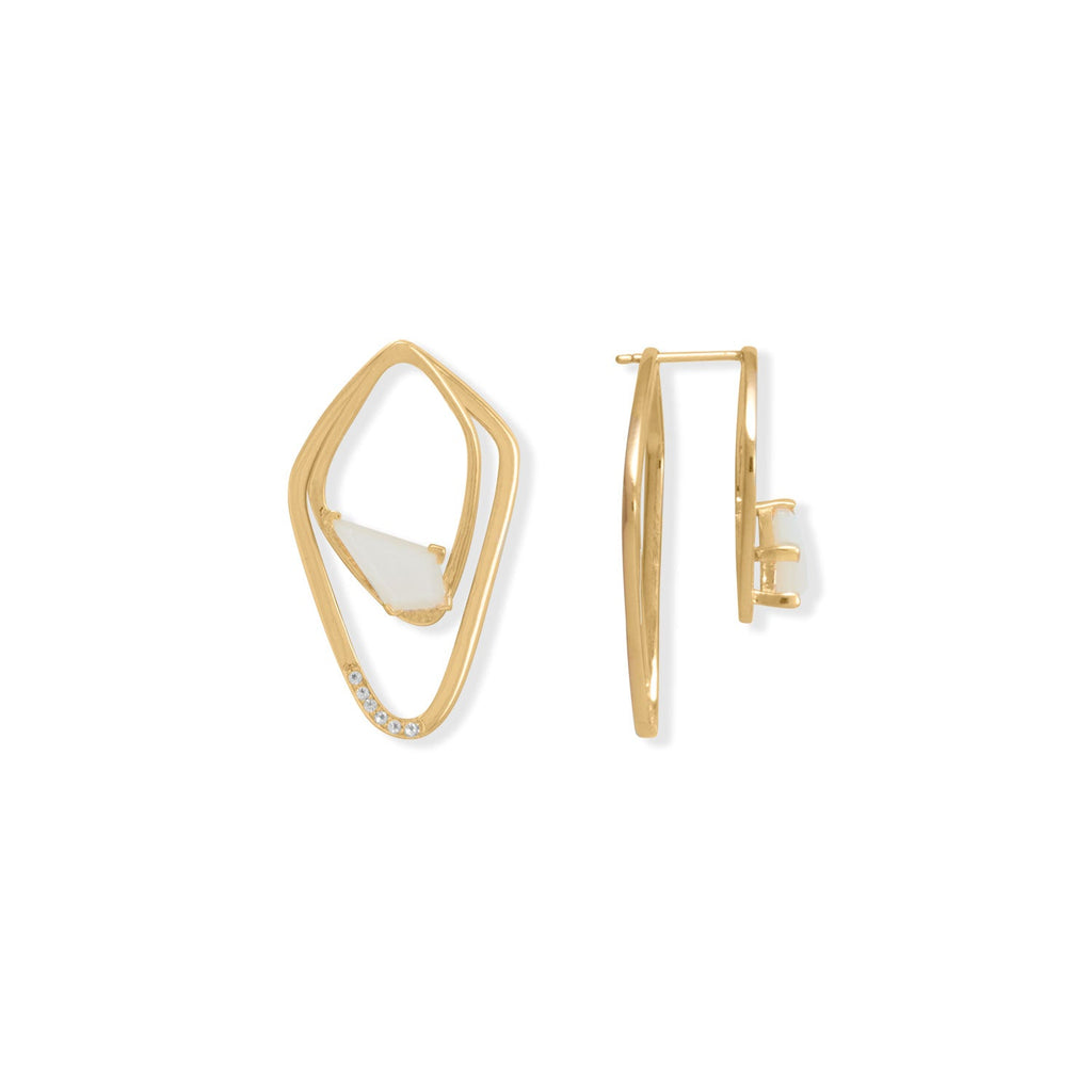 Gorgeous earrings...so many ways to show them off! 14 karat gold plated sterling silver earrings feature a 15mm x 24mm kite-shaped post earring with 6mm x 12mm fancy cut moonstone and a 20mm x 34mm kite-shaped earring jacket with 1mm white topaz accents. Post earrings can be worn with or without earring jackets! .925 Sterling Silver Pro tip: Add sparkly studs to the earring jackets for even more ways to wear!