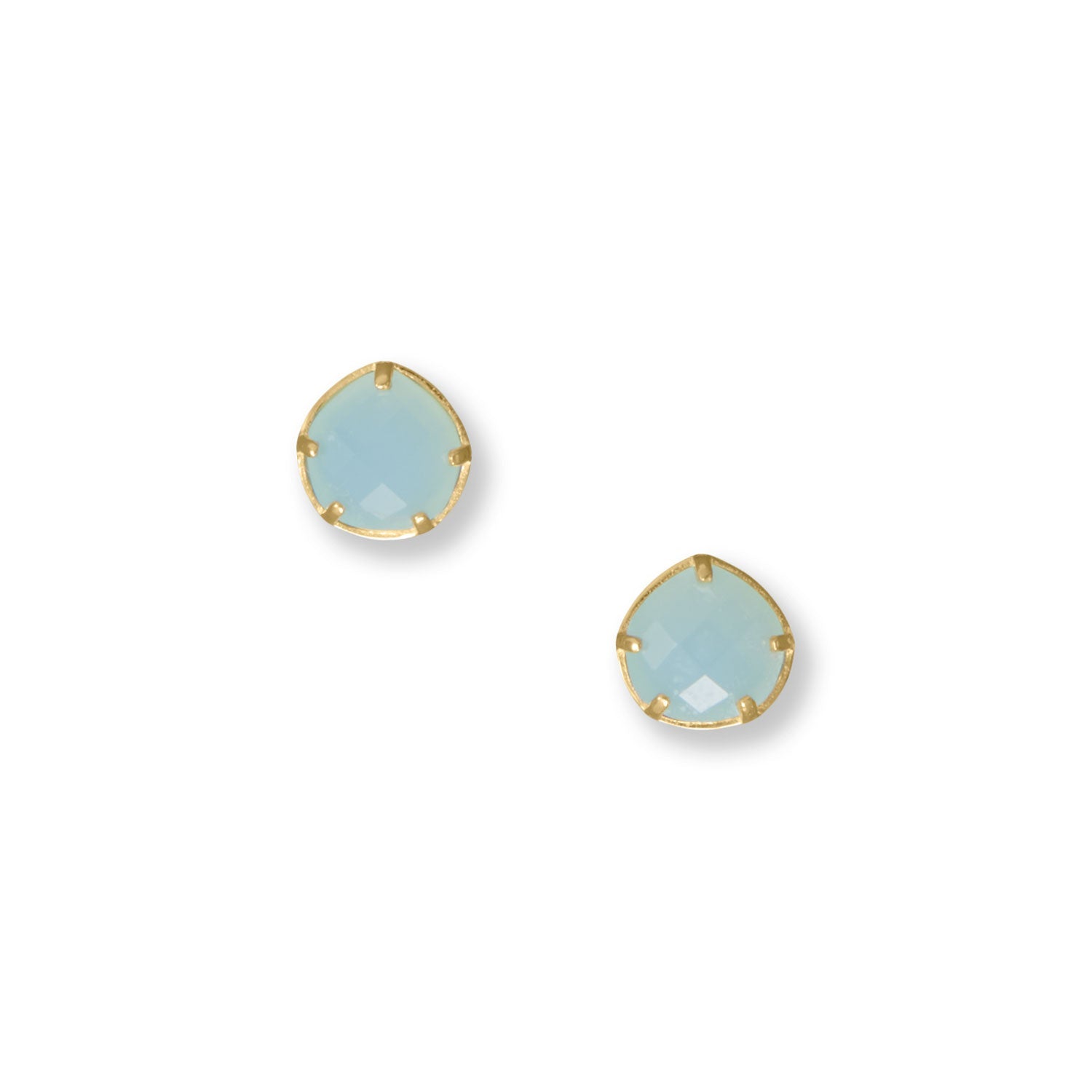 Dainty delight. 14 karat gold plated sterling silver stud earrings feature 8mm fancy cut aqua chalcedony. .925 Sterling Silver