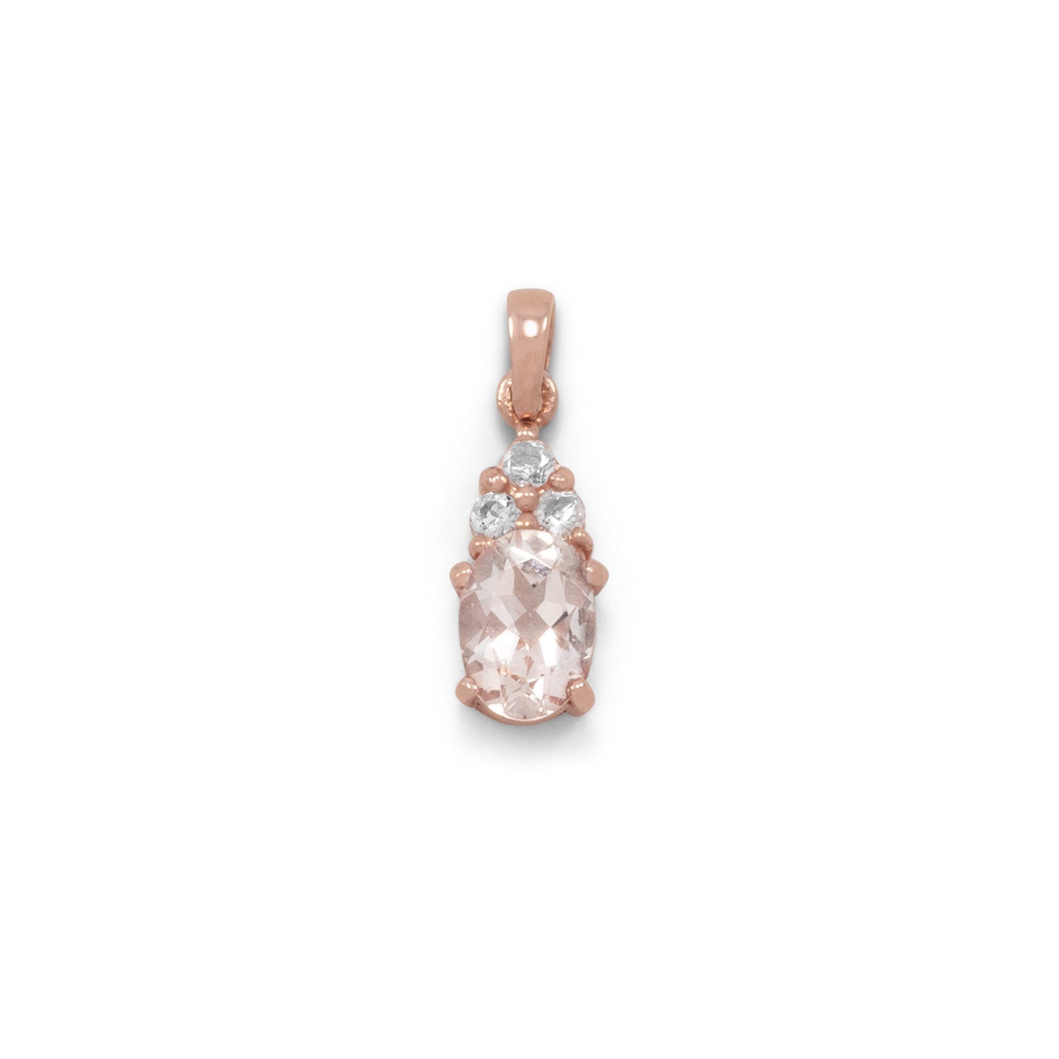 14 karat rose gold plated sterling silver pendant with 5mm x 7mm oval morganite and three 1.5mm white topaz. The pendant hangs approximately 16mm. .925 Sterling Silver